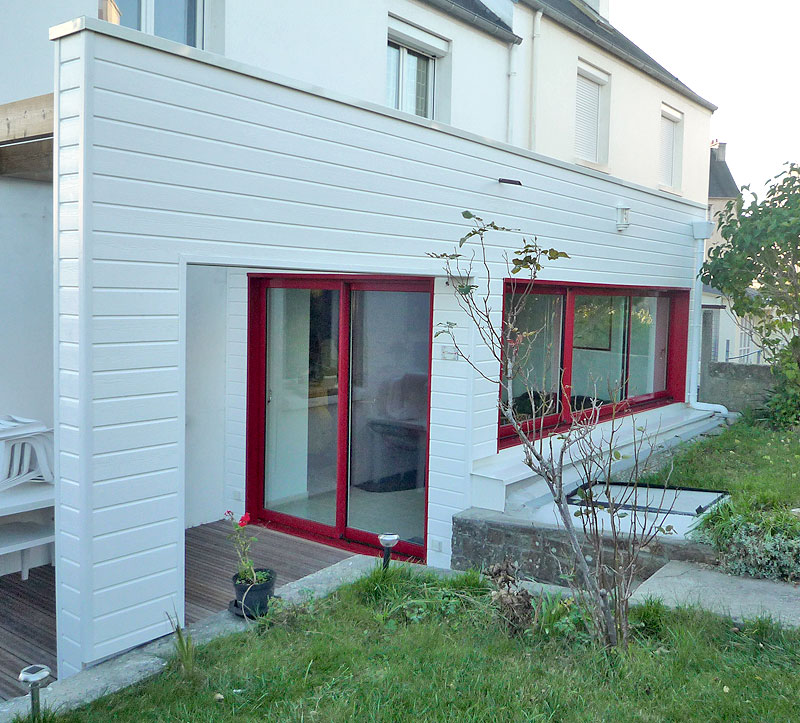 Extension en ossature bois sur maison de quartier avec bardage Werzalit, menuiseries Aluminium rouge, terrasse bois en Ipé.
